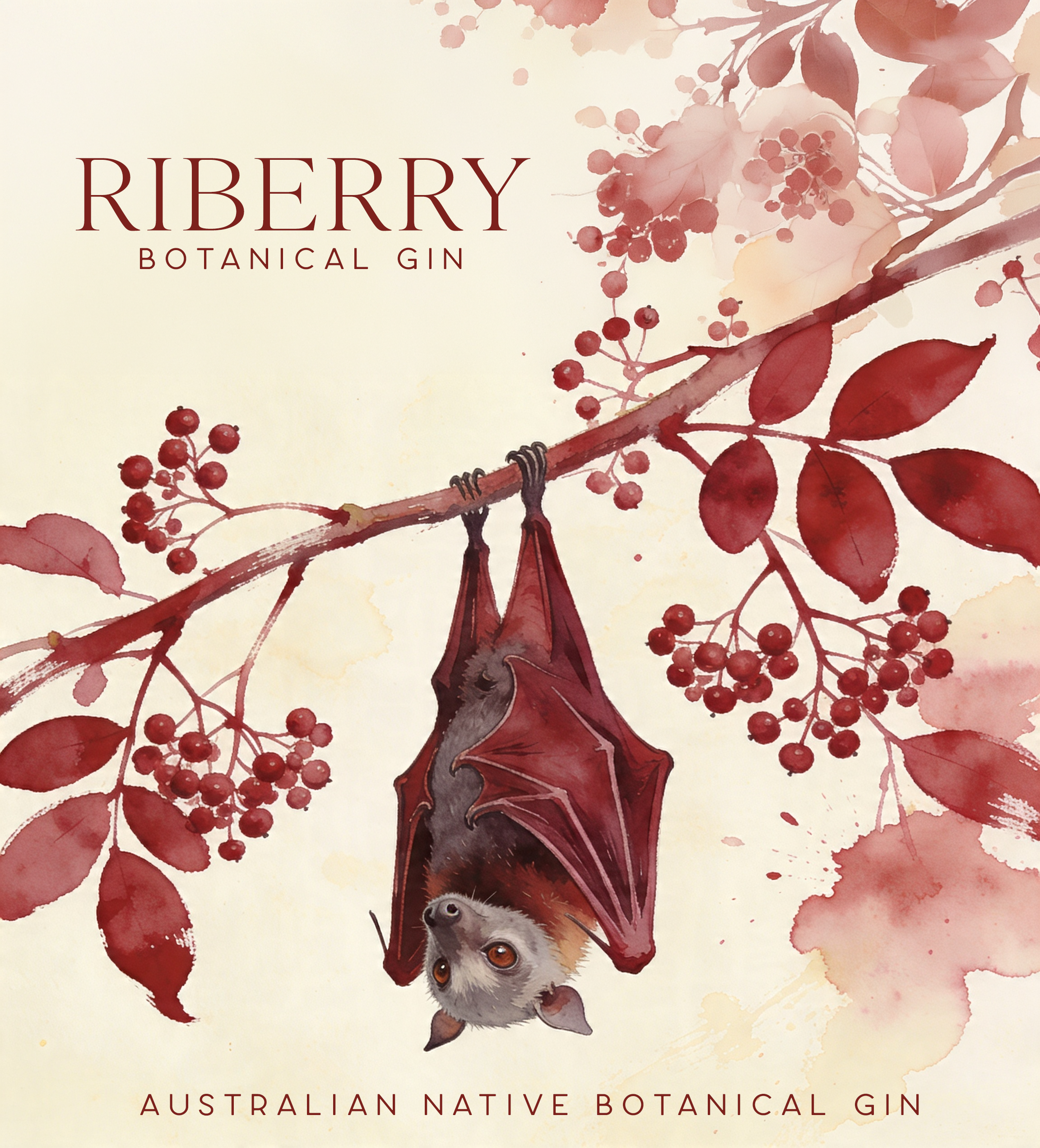 Riberry is a fictional premium Australian gin with a specific visual world — blush crimson liquid, cream watercolour labels, native animals tied to the botanicals they're named after. The flying fox is on the bottle because flying foxes are the primary seed dispersers of riberry trees in the wild. That's not decoration. That's story.